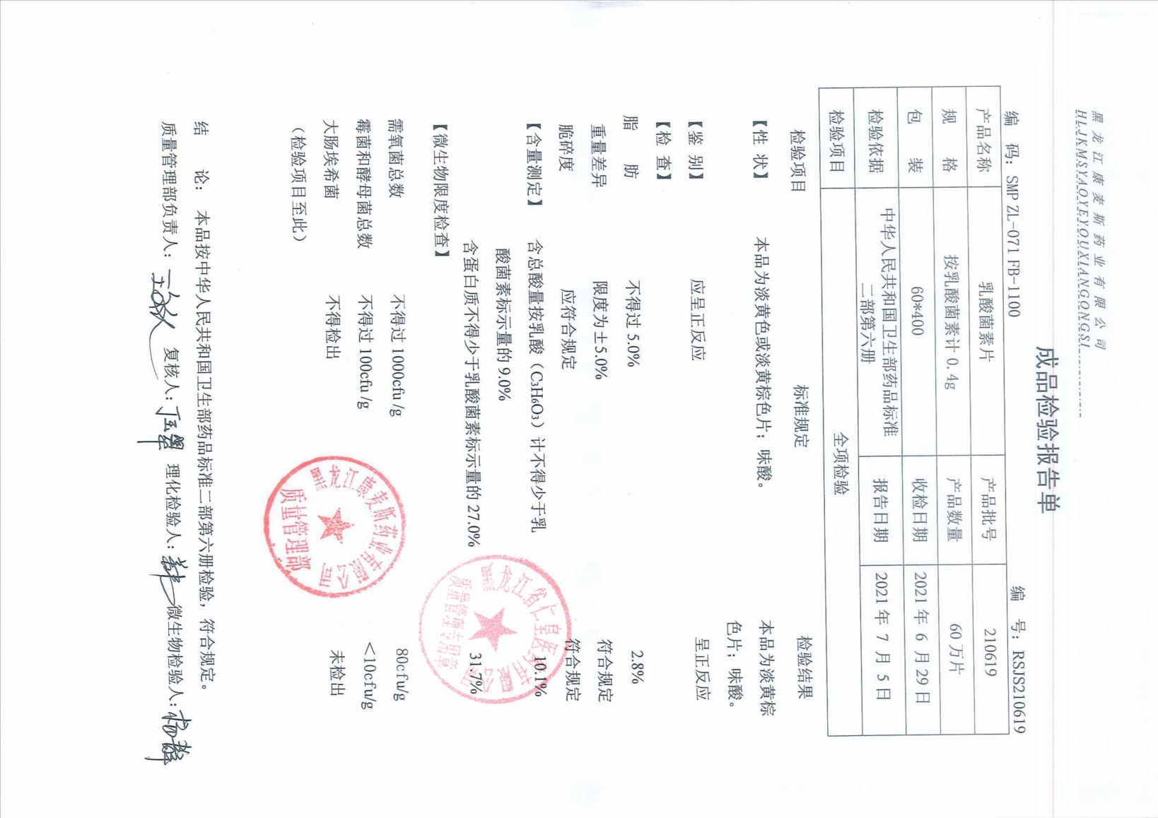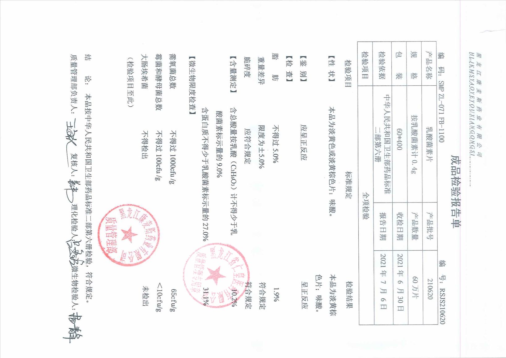 乳酸菌素片21061