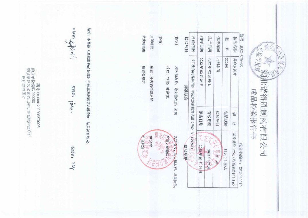 養(yǎng)血安神片22020