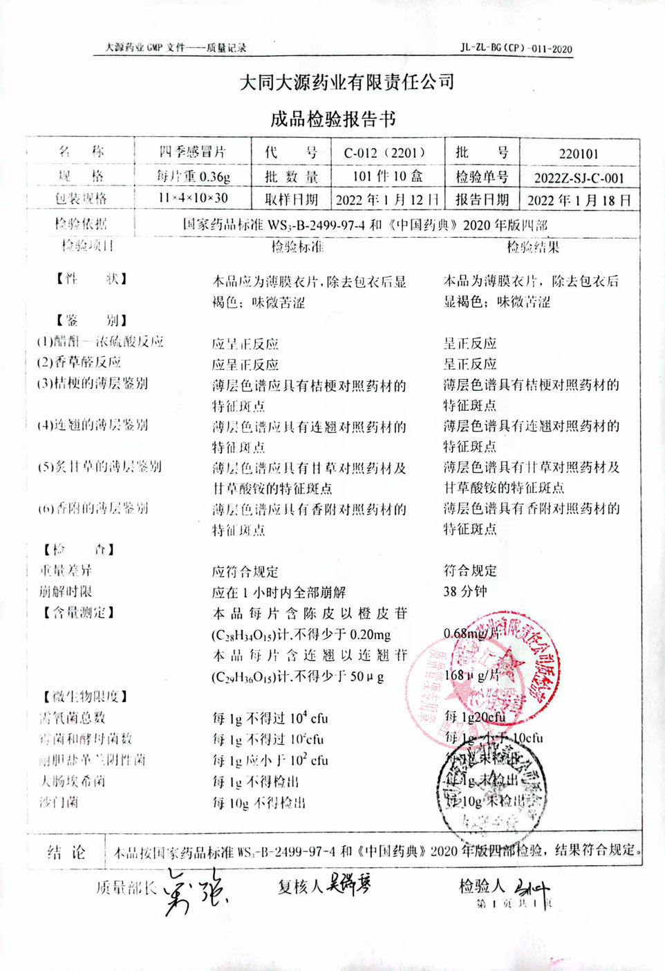 四季感冒片22010